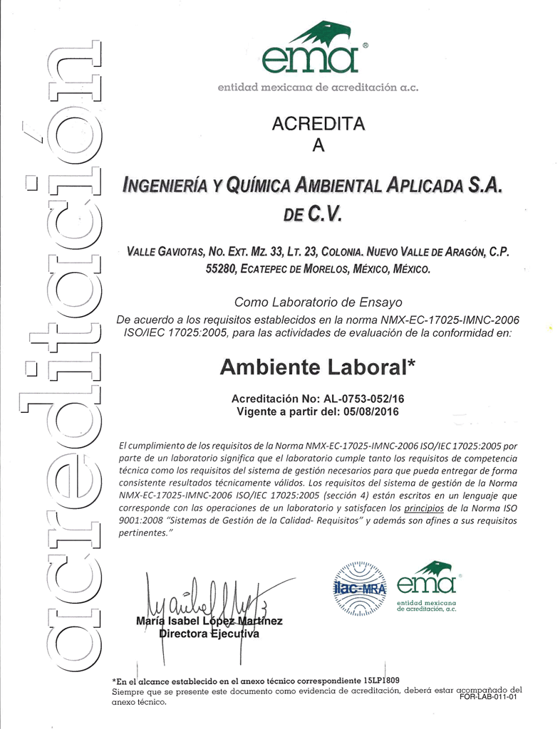 El 5 de agosto del 2016 la “EMA” (Entidad Mexicana de Acreditación A. C.) nos otorga la acreditación como un Laboratorio de ensayos en Ambiente Laboral.