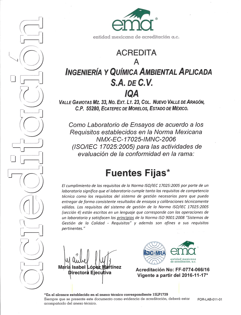 En IQA estamos orgullosos de obtener las acreditaciones AL-0753-052/16 y FF-0774-066/16 emitidas por la “entidad mexicana de acreditación a. c.” las cuales nos respaldan en cada servicio que ofrecemos.